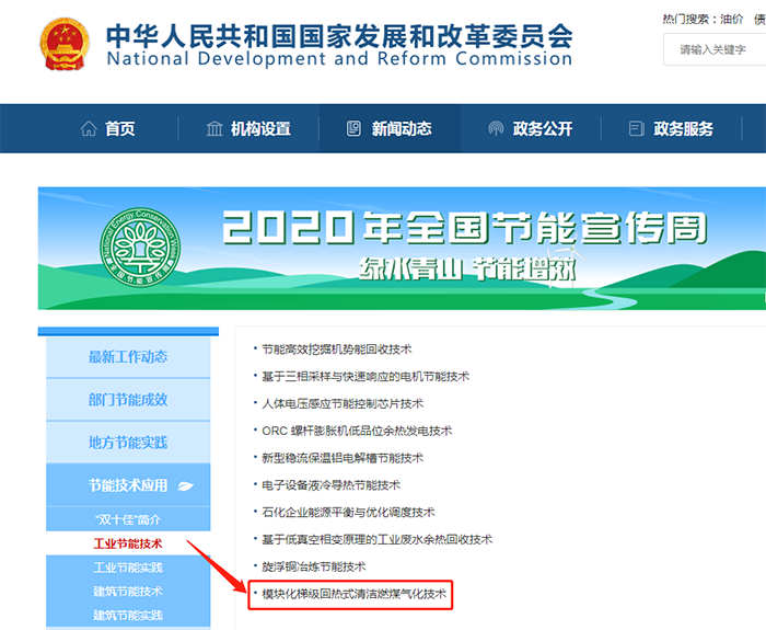 安徽科達潔能“模塊化梯級回熱式清潔燃煤氣化技術”作為節能宣傳周工業節能技術之一在國家發改委官方網站上進行了“云”上展示,分別從技術原理、技術指標、節能效果、應用領域等方面進行了全方位介紹。